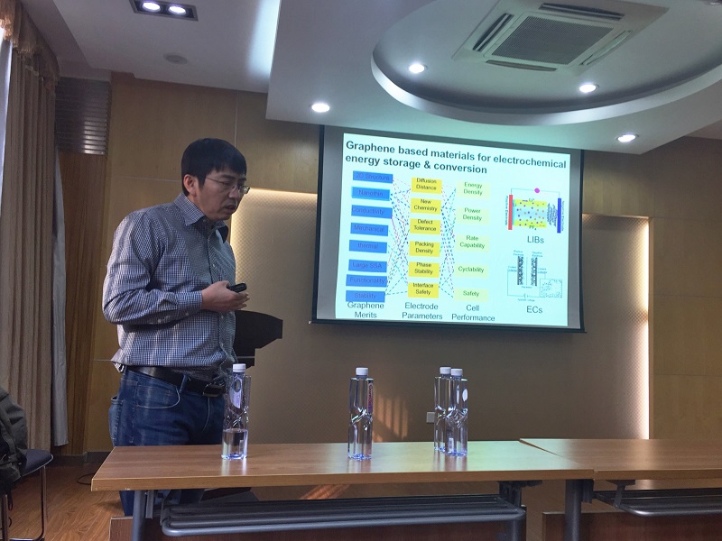 在讲座中,李峰教授结合课题组已有工作成果,从基础研究、材料研究到器件研究以及产业化发展,层层递进,介绍了石墨烯与金属氧化物的协同作用,石墨烯基材料在柔性电极等新型电池器件、以及锂硫电池正极材料载硫中的应用,以及电化学电位调控等几个方面的内容。他指出了石墨烯等新型炭材料在电化学能源存储中的巨大价值和研究潜力,从材料学的机理,向老师和同学们展现了碳基材料在电化学中的魅力。讲座现场座无虚席,李峰教授精彩的报告激发了老师和同学们对于电化学的更多方面的思考,报告后,他与师生们展开了热烈的讨论。李峰教授对于科研的严谨作风、深入浅出的讲解、以及对员工和蔼的态度,在同学们心中留下了深刻的印象。